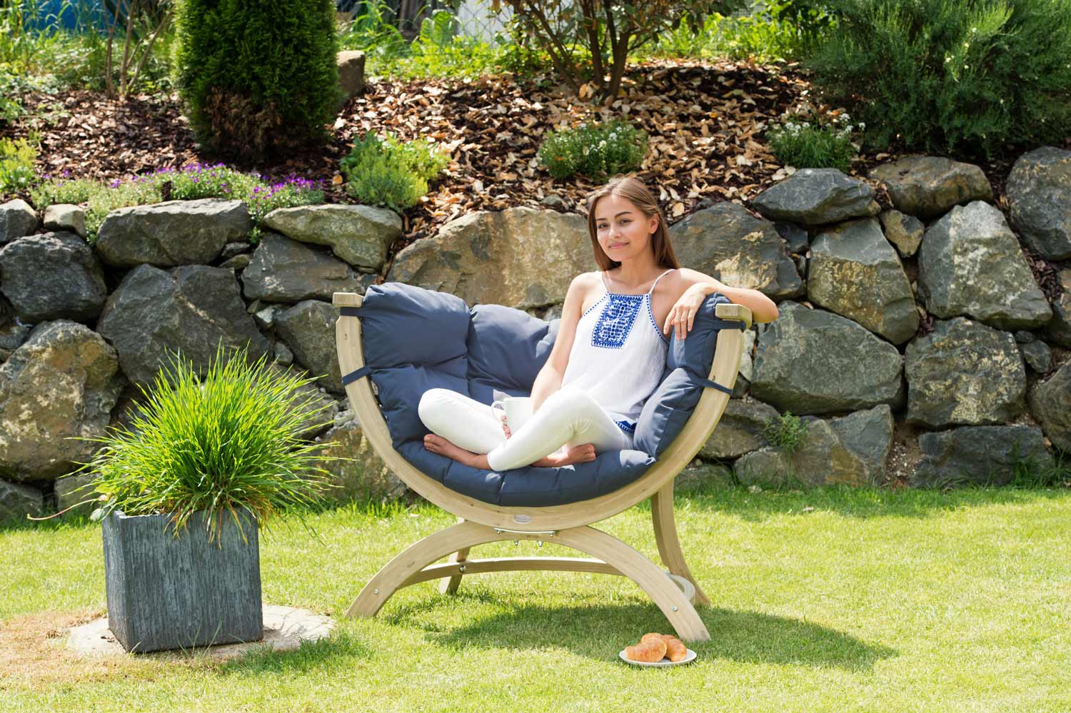 Meerdere lagen van weerbestendig vurenhout garanderen een maximum aan stabiliteit en veiligheid. De “Globo Chair” is uitgerust met een groot zacht kussen, waardoor het een echte gezellige plek wordt.