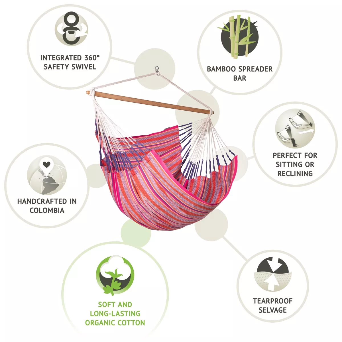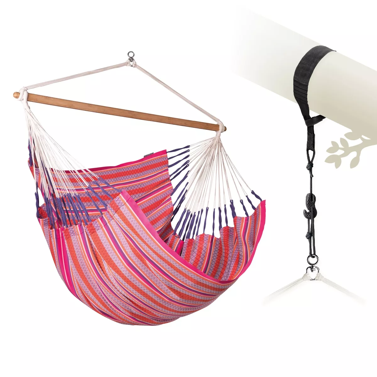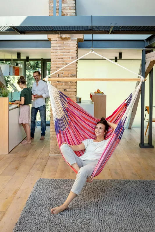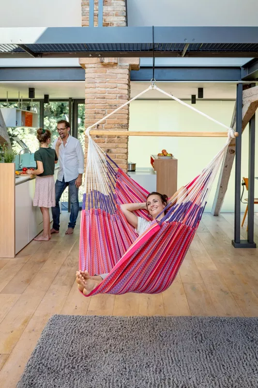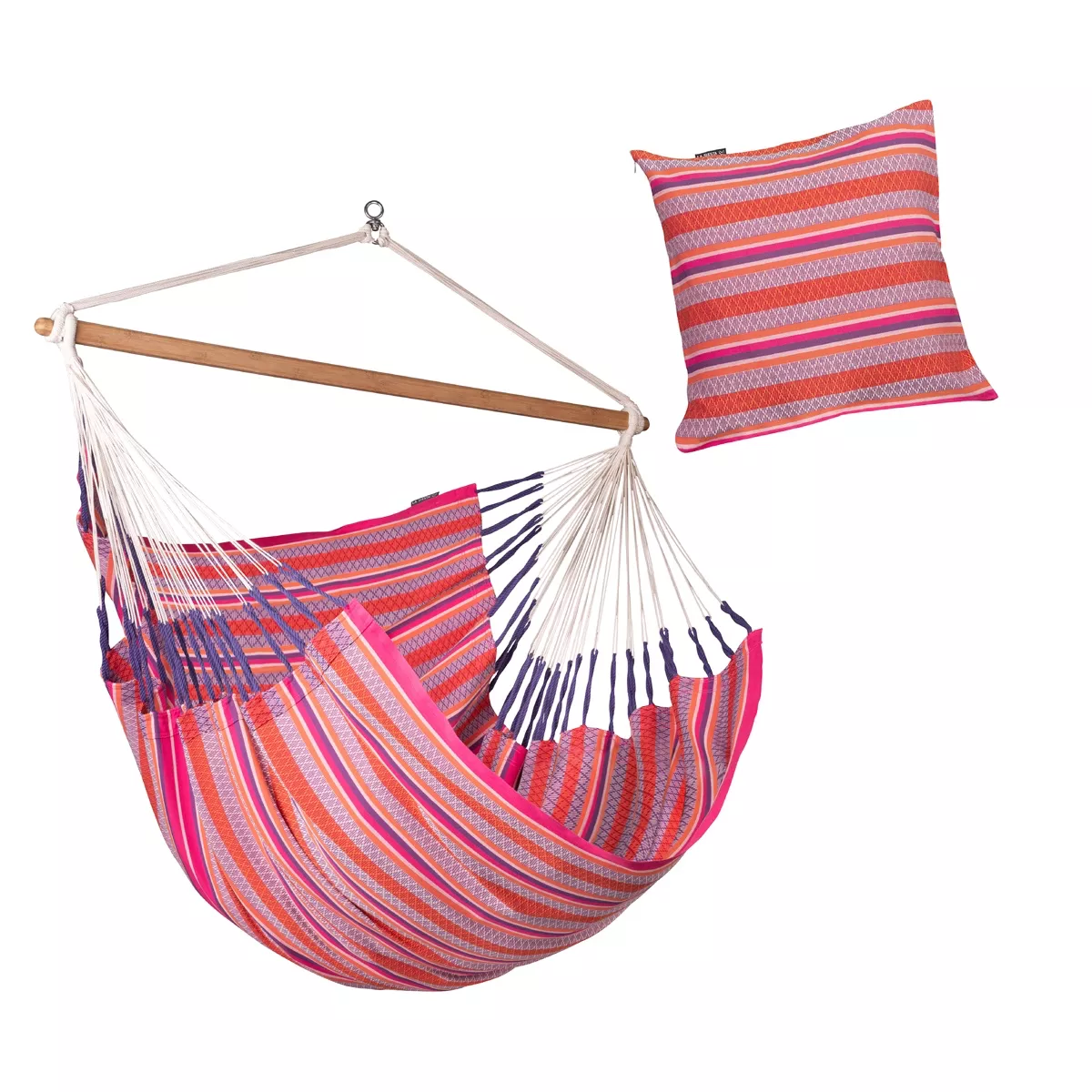 Habana Flamingo lounger XXL. Gemaakt van gecertificeerd organisch katoen voor een heerlijke zweef ervaring! Bijzonder weefpatroon in rood en roze tinten.