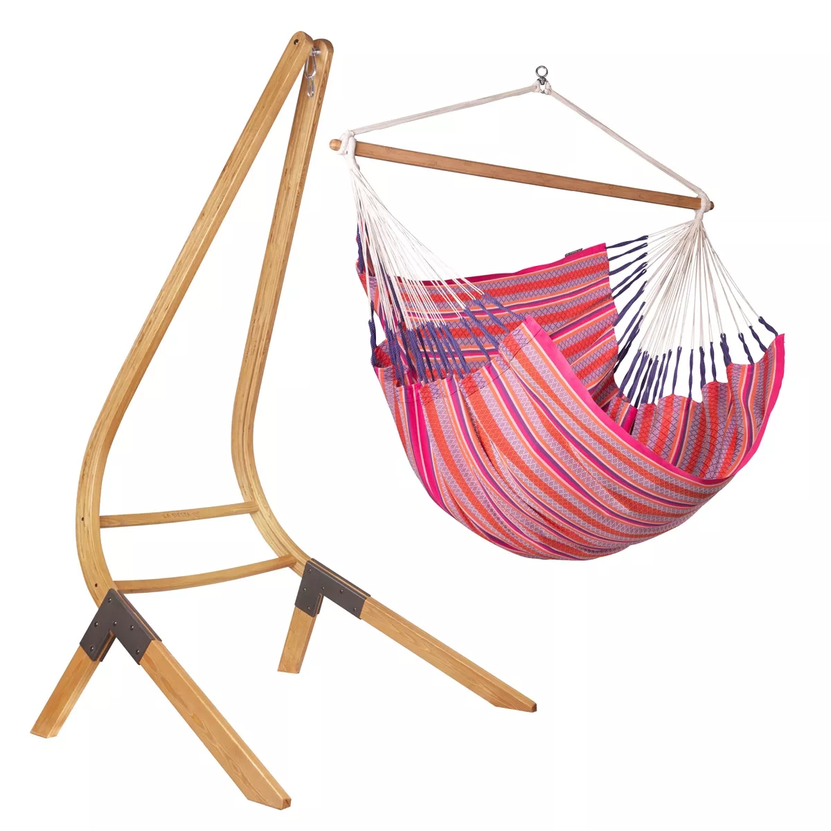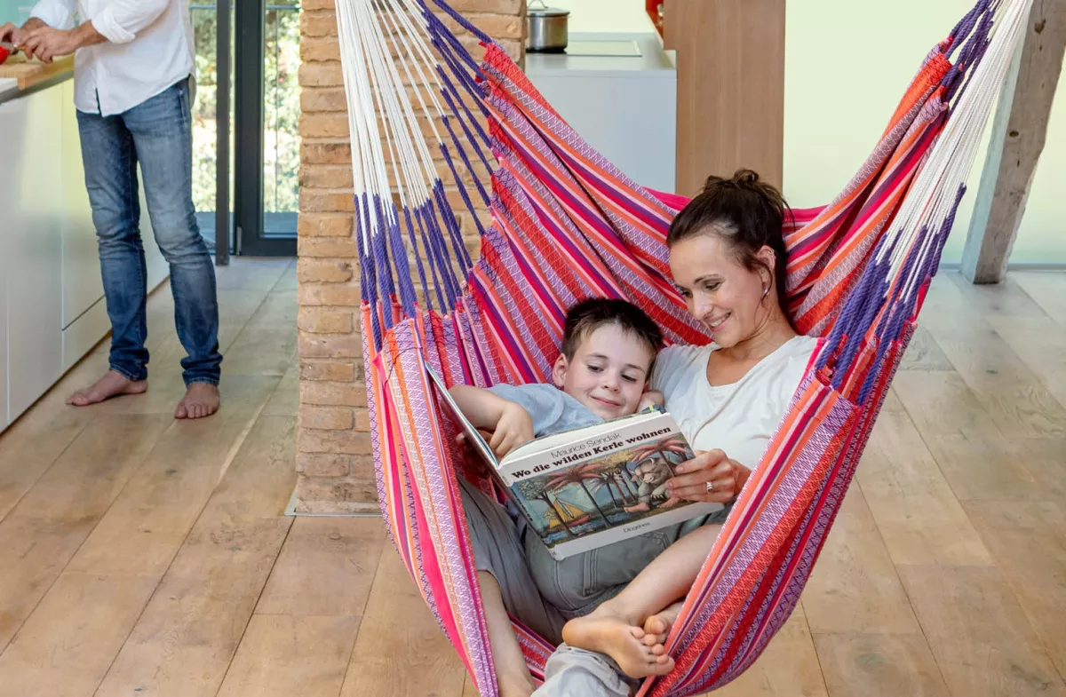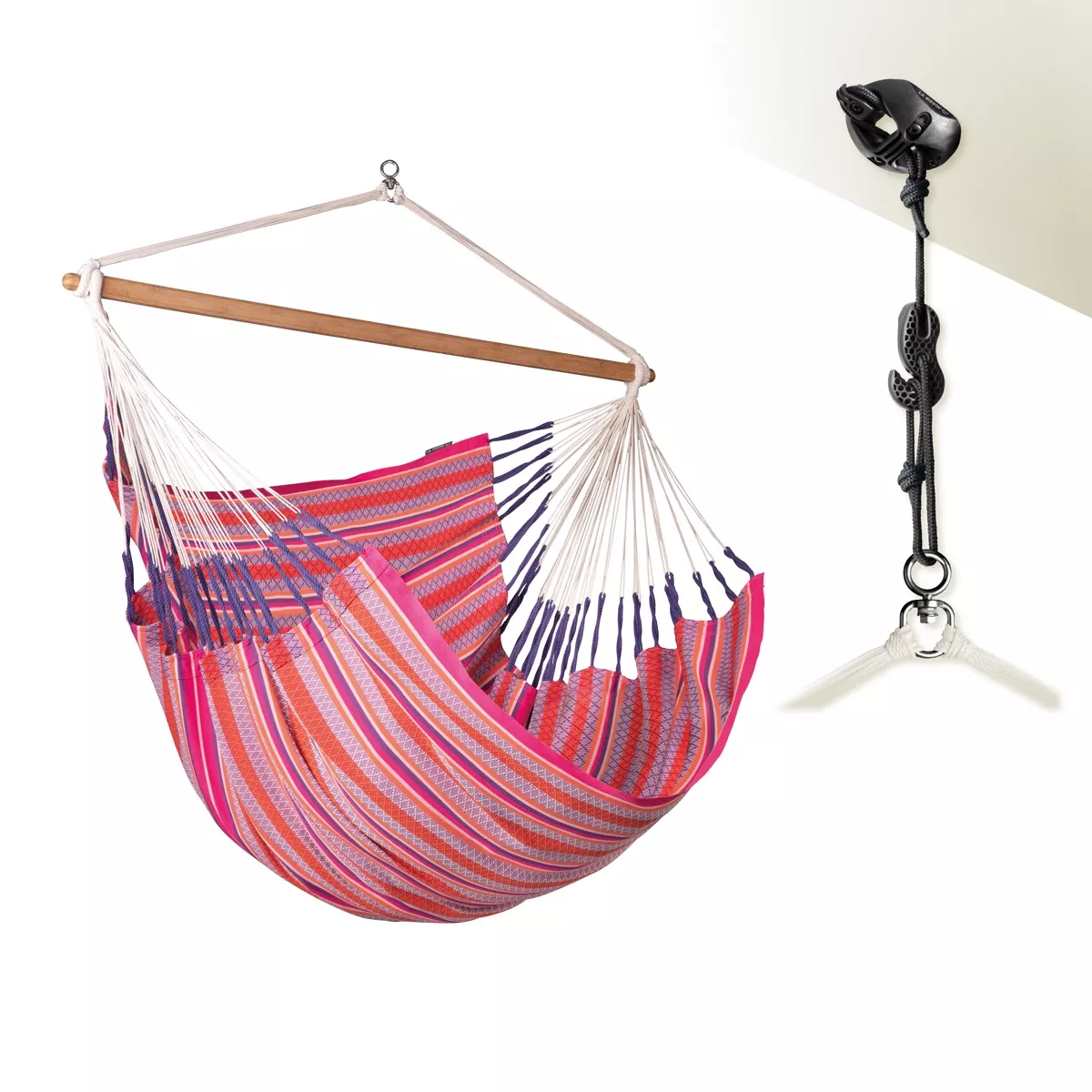 Habana Flamingo lounger XXL. Gemaakt van gecertificeerd organisch katoen voor een heerlijke zweef ervaring! Bijzonder weefpatroon in rood en roze tinten.