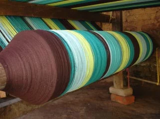 Lazy Rezt hangmat in een combinatie van blauw en groen tinten met chocolade bruin. Met pinewood spreidstok 100 cm. breed.