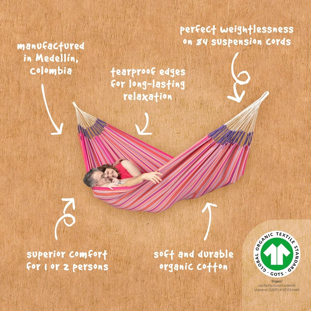 In bijzonder geweven patroon met een flitsende kleurstelling. Afmeting doek: 260x180 cm. Totale lengte: 400 cm • Max. belastbaar gewicht: 200 kg
