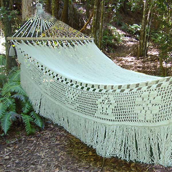 Lazy Rezt Queen hangmat. in een royale afmeting, handgehaakt van heerlijk zacht katoendraad. Met mooie franjes aan de zijkanten en kwasten aan de uiteindes van de stokken.