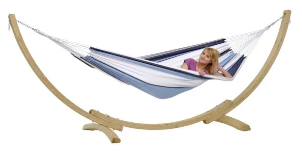 Standaard Apollo met blauw witte hangmat. Stabiel en zeer comfortabel.
