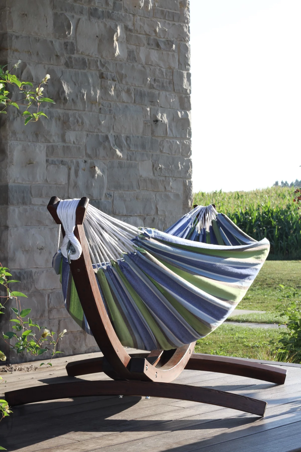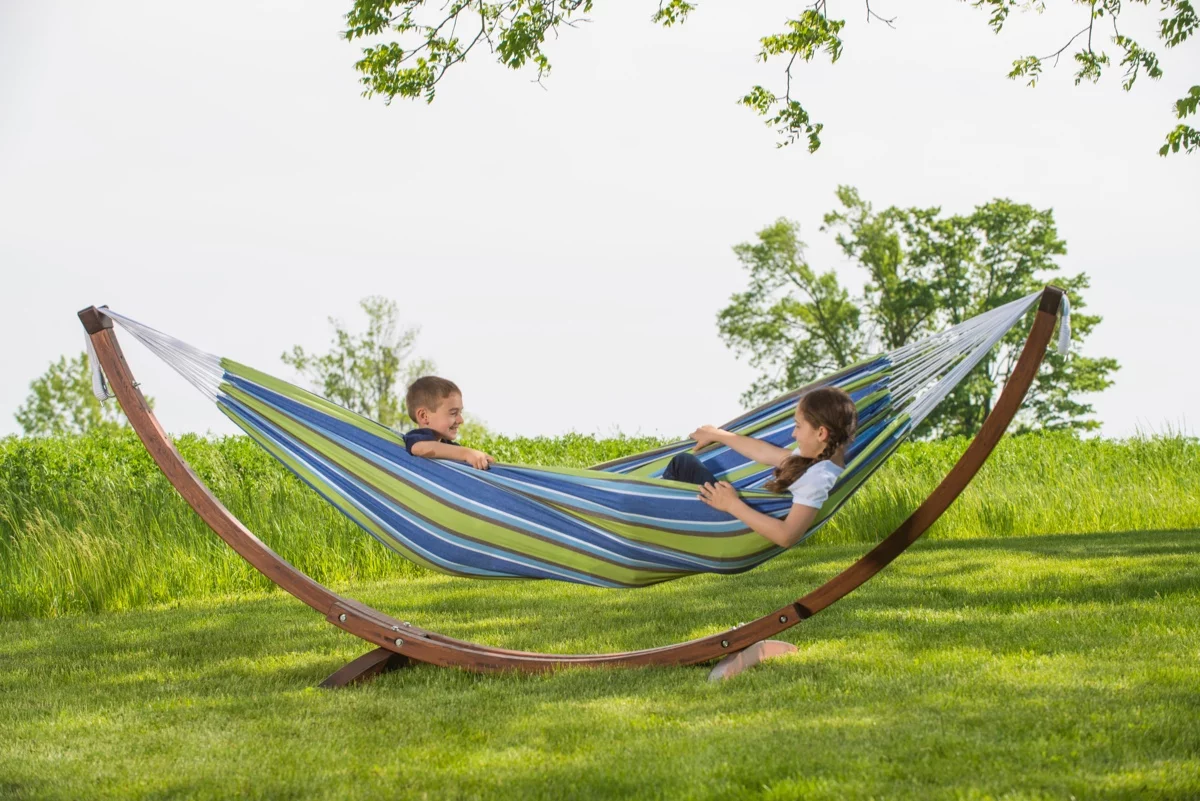 De massief grenen standaard is van duurzaam materiaal en wordt geleverd met een stevige dubbele katoenen hangmat.