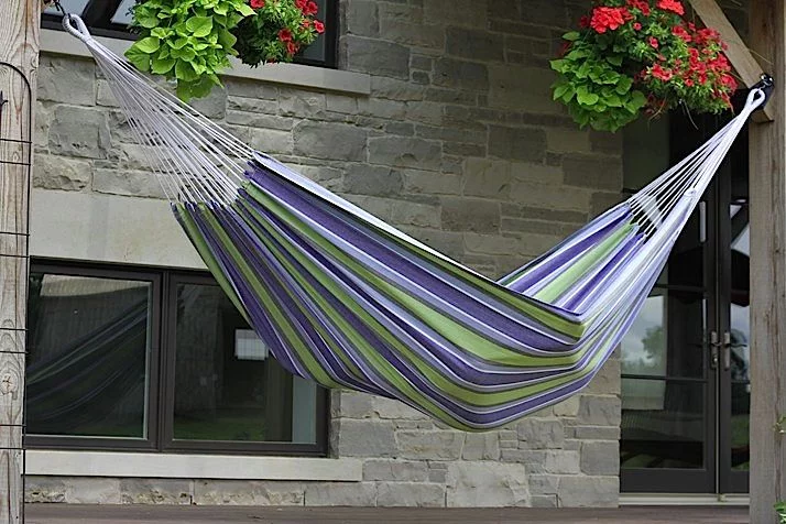 Het opvallende frame van massief hout zorgt ervoor dat deze tweepersoons katoenen hangmat met massief grenen standaard zich onderscheidt van de rest.