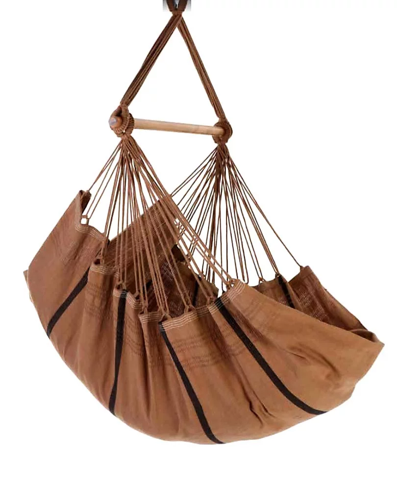 Mooie kwaliteit hangstoel in cacao bruin met een smalle donkere streep. 100 % katoen • afmeting doek: 170x130 cm • stokbreedte 110 cm
