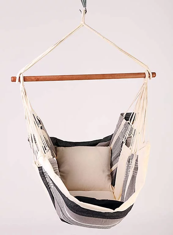 Mooie kwaliteit hangstoel in wit-zwart tinten. Wordt geleverd Incl. handige opbergzak. 100 % katoen