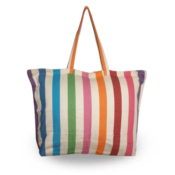 Kleurige en hippe strandtas of vrijetijdstas van 100% katoen. Met of zonder rits verkrijgbaar. Tevens voorzien van een extra vakje voor bijv. telefoon, sleutelbos of portomoneetje. Met een heerlijke ruime inhoud een tas voor alledag.    Afmeting tas L / B / D: 45 / 60 / 15cm.   Lengte hengsel 60cm.